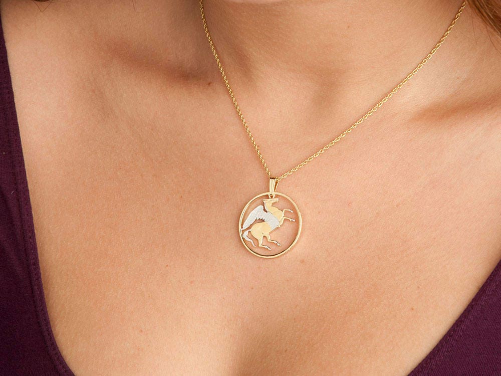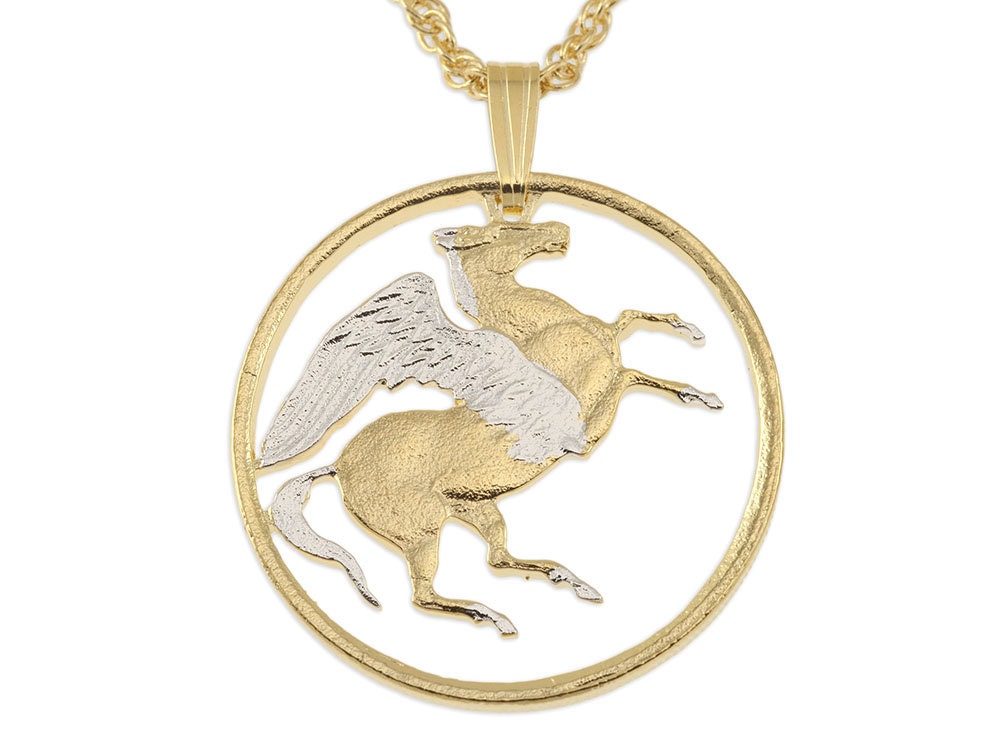 The Greek 10 Draxmai was issued only in 1973 and was part of a set of coins featuring Greek Mythology. This coin features Pegasus the winged horse. I have been offering this coin sense 1977 and it has always been a hit for us, It is plated in our 14 Karat Gold and Rhodium finish. Comes complete with a 14 Karat Gold plated chain.
